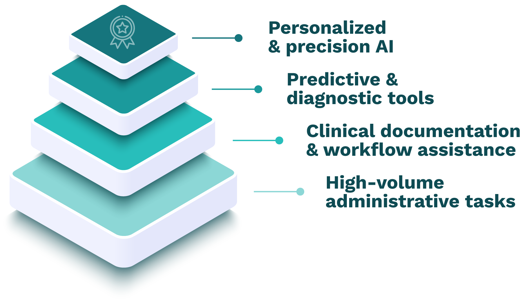 | Scaling | Sepsis prediction, readmission risk, order recommendations | ✅ Regulatory clarity emerging ✅ Strong clinical demand | ❌ Alert fatigue risks ❌ Governance and validation burdens | Augmented decision-making Improved outcomes Efficiency Cost containment |