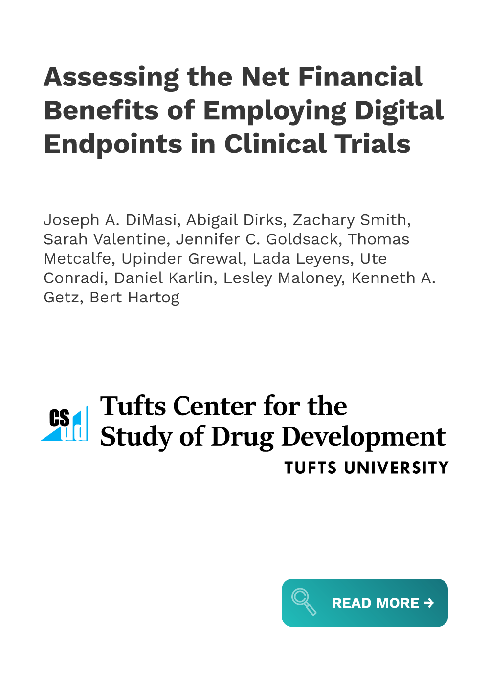 Informed by findings from DiMe’s partnership with Tufts Center for the Study of Drug Development and industry leaders at Johnson & Johnson, Roche, Genentech, UCB, Bayer, Takeda, and MindMed, the ROI calculator provides evidence-backed insights into the cost savings and financial benefits of using digital endpoints in clinical trials.
