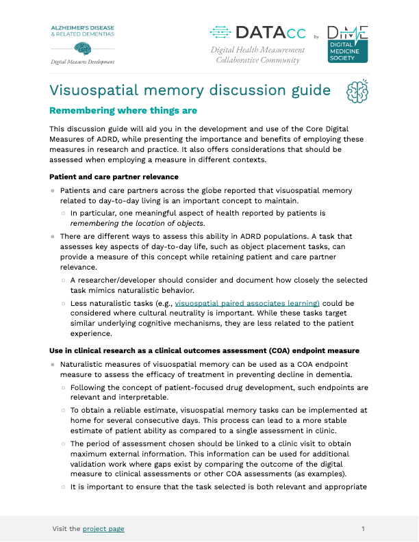 This discussion guide supports the effective implementation of the core set of digital measures of ADRD by offering structured prompts for exploring the visuospatial memory ontology.
