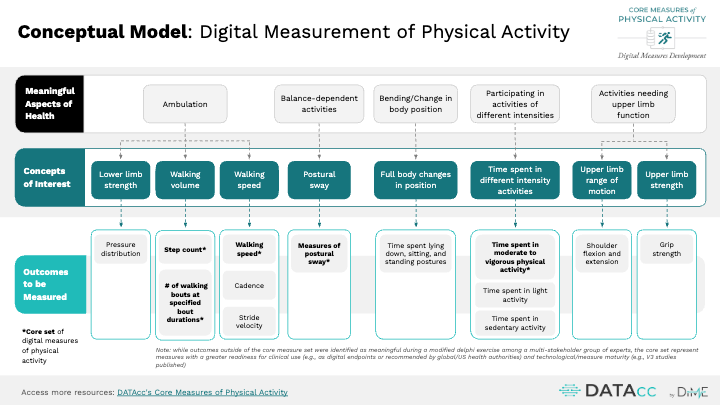 Drug developers, digital health technology companies, regulators, researchers, clinicians, patient groups, healthcare payers, and healthcare implementers can use the Conceptual Model to make decisions about using evidence-based digital measures of physical activity (PA) as endpoints in clinical trials or for patient monitoring in clinical care.