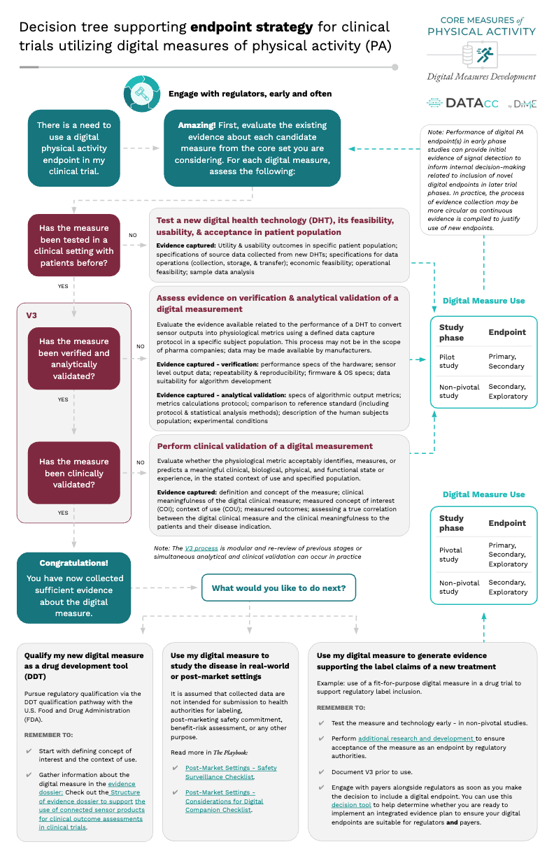 - Perform necessary research – and engage with regulatory colleagues early and often – to ensure regulatory acceptance of the digital PA measure as an endpoint to support a label claim, and/or use of digital PA measure in post-market settings (see decision tool).