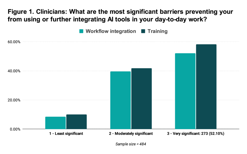 The top barriers cited across roles included: Workflow integration (72%), unclear leadership direction (68%), limited staff capacity/training (61%)