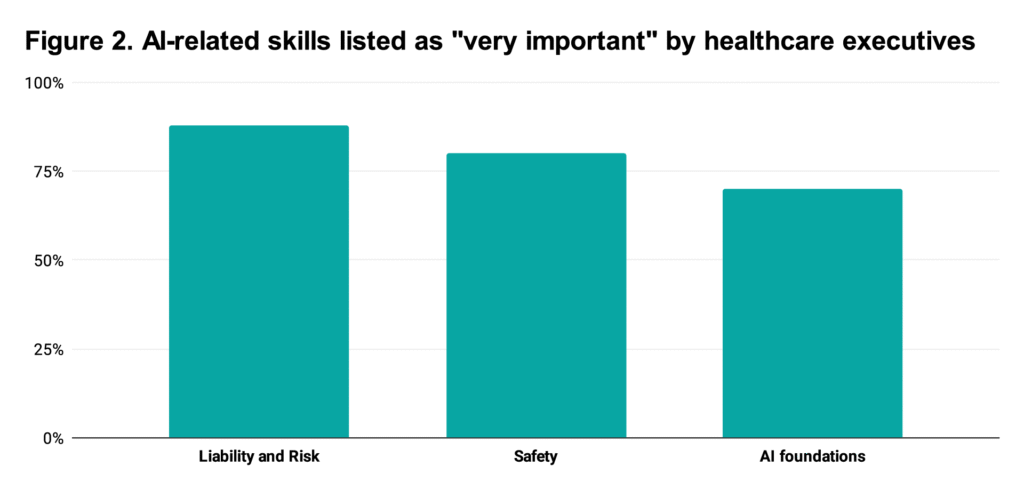 - “Liability and risk”, “safety”, and “understanding AI foundations” were listed amongst the most important skills by executives (Figure 2).Â