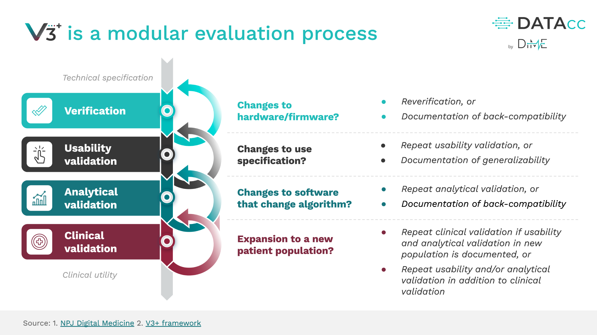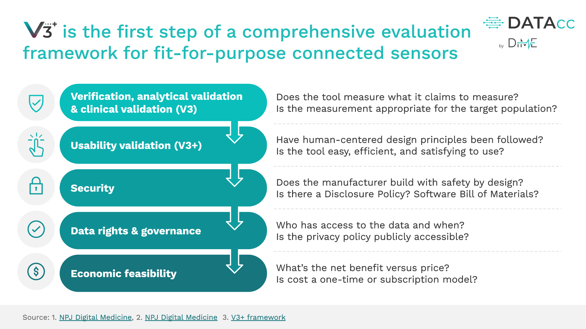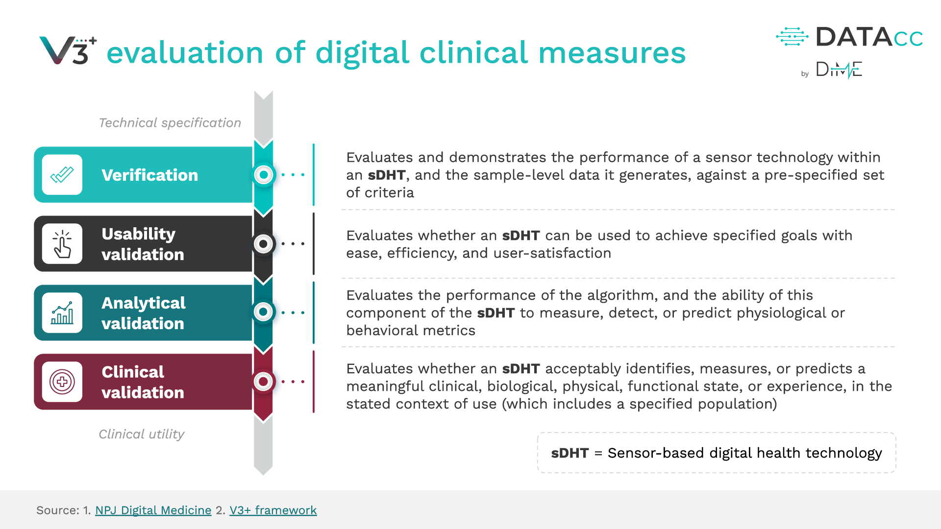 The Digital Health Measurement Collaborative Community (DATAcc) by the Digital Medicine Society (DiMe) has extended DiMe’s Verification, Analytical Validation, and Clinical Validation (V3) Framework with V3+ to include a fourth component – usability validation.